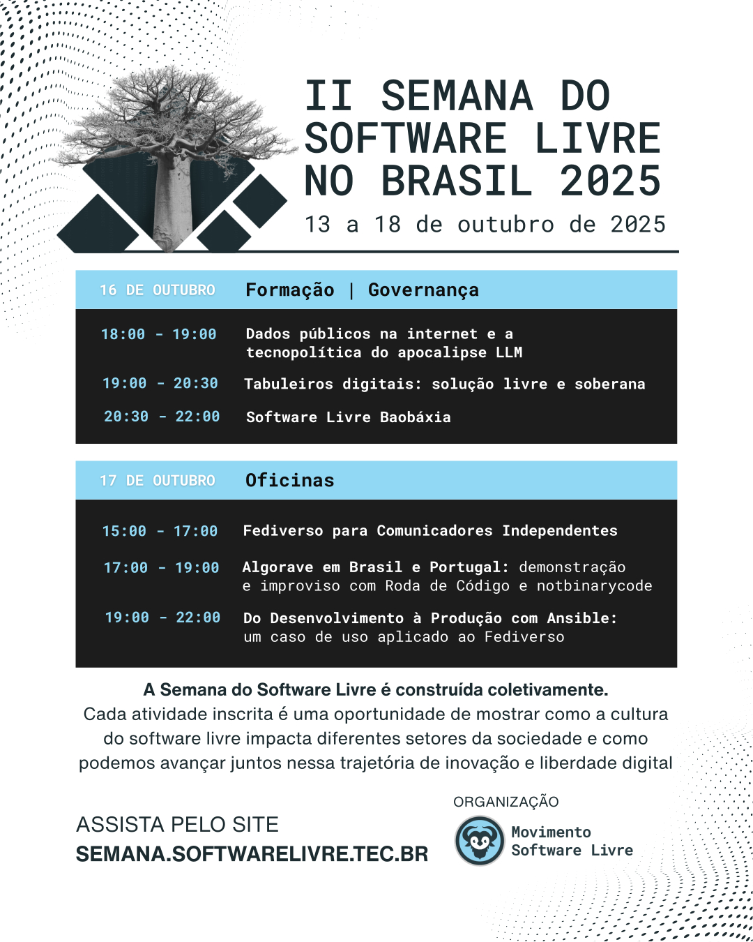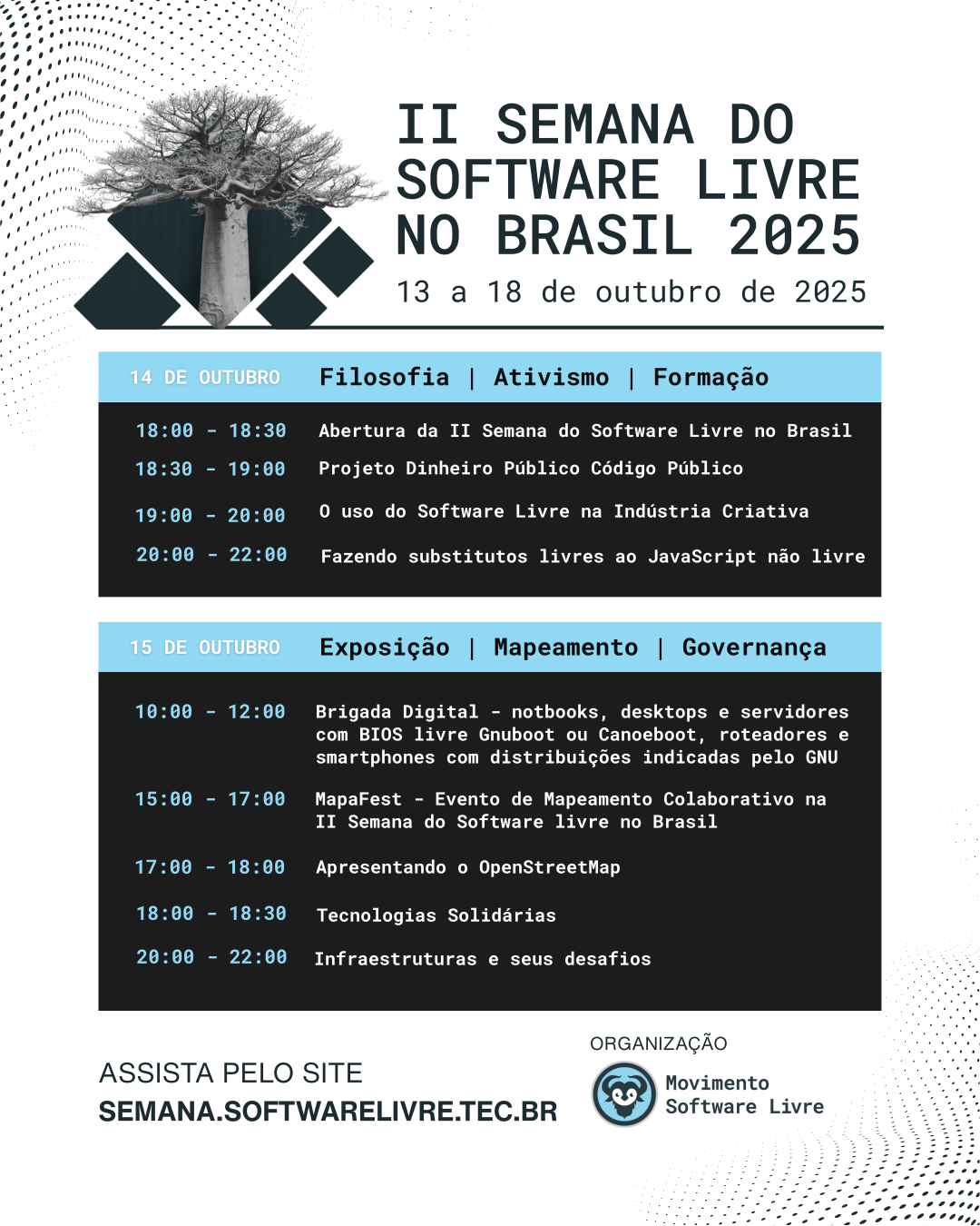 A Semana do Software Livre é construída coletivamente. Cada atividade inscrita é uma oportunidade de mostrar como a cultura do software livre impacta diferentes setores da sociedade e como podemos avançar juntos nessa trajetória de criatividade, soberania e liberdade digital.