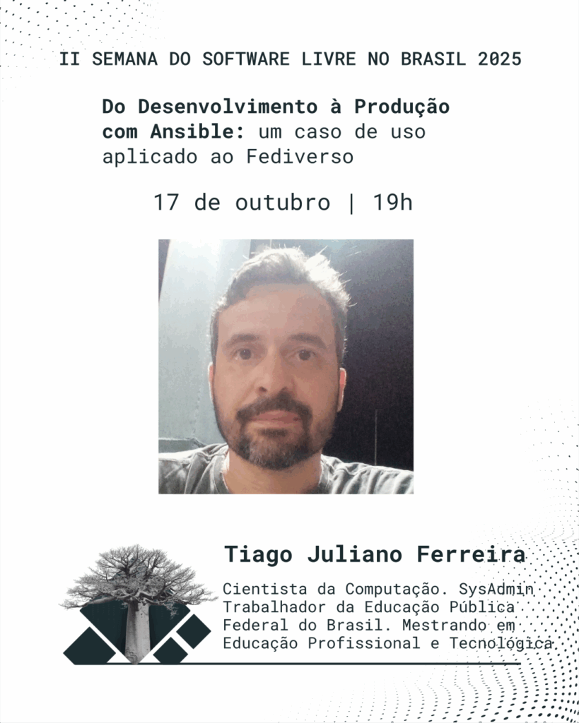 Tiago j. Ferreira. Graduado em Ciência da Computação com mestrado em Educação Profissional e Tecnológica, atua como Técnico em TI no IFSC Câmpus Tubarão nas áreas de administração de sistemas Linux (SysAdmin), redes de computadores e suporte. Tem experiência de cerca de 20 anos nas áreas de redes de computadores, DevOps, infraestrutura como código e segurança da informação. Áreas de interesse: redes e sistemas distribuídos, infraestruturas descentralizadas, software livre, pedagogias críticas e trabalho.