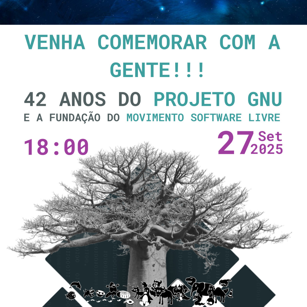 Online - Semana.softwarelivre.tec.br , BrazilEvento Pré-Semana do Software Livre no Brasil – 27/09/25 🍥 Neste sábado, dia 27/09, às 18h, celebraremos os 42 anos do Projeto GNU — marco histórico na luta pela liberdade no usuário e desenvolvimento de tecnologias Livres. Convidamos as comunidades e pessoas interessadas para festejar conosco e refletir sobre os rumos do Movimento Software Livre… Continue a ler »🍥 Pré-Semana do Software Livre no Brasil – 27/09/25