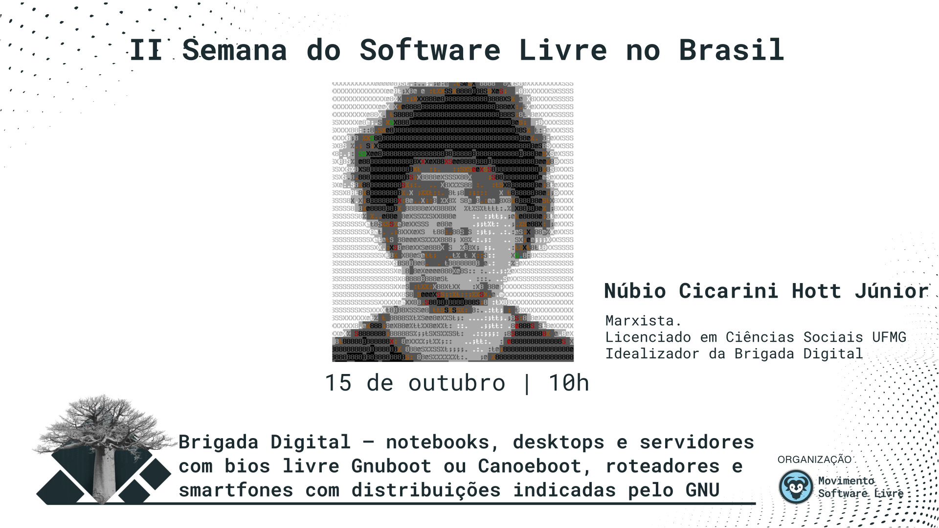 Online - Semana.softwarelivre.tec.br , BrazilVenha conhecer a Brigada Digital e sua proposta de levar a Filosofia do Software Livre para a vida. Quarta, 15/10 às 10h As atividades serão transmitida ao vivo no canal do Software Livre da Fediverse TV.https://fediverse.tv/c/softwarelivre_channel A programação completa e mais informações podem ser acessadas no site do evento:https://semana.softwarelivre.tec.br Resumo Apresentar a Brigada Digital e… Continue a ler »Brigada Digital – notebooks, desktops e servidores com bios livre Gnuboot ou Canoeboot, roteadores e smartfones com distribuições indicadas pelo GNU