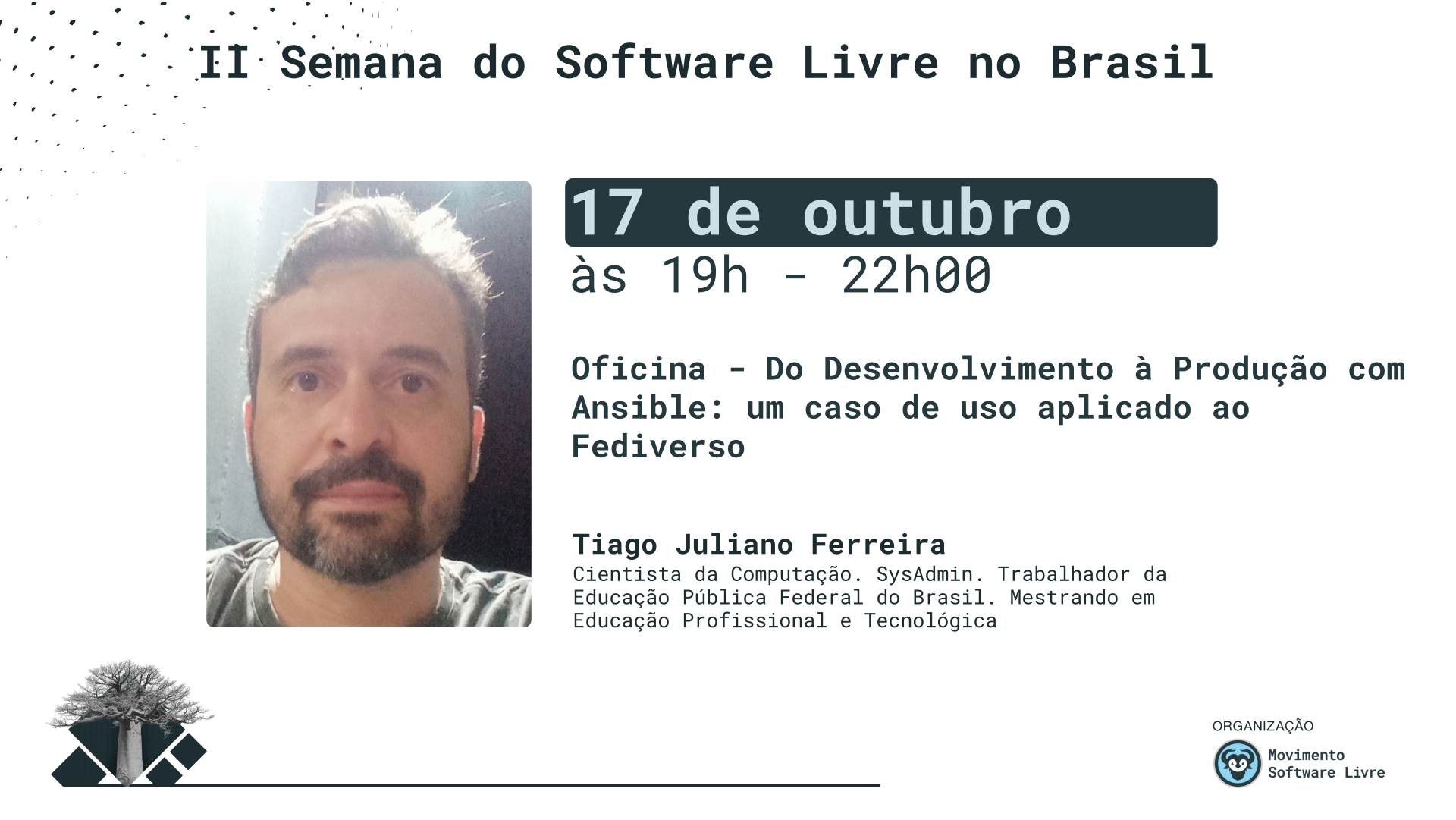 Online - Semana.softwarelivre.tec.br , BrazilOficina de Ansible básico para Semana Nacional de Ciência e Tecnologia - IFSC Campus Tubarão, Semana Acadêmica do curso de Análise e Desenvolvimento de Sistemas deste campus, também compondo a Semana Nacional do Software Livre e as estratégias de divulgação e adoção do Fediverso organizadas pela Associação Alquimídia. Para isso, o objetivo da oficina é… Continue a ler »Oficina – Do Desenvolvimento à Produção com Ansible: um caso de uso aplicado ao Fediverso